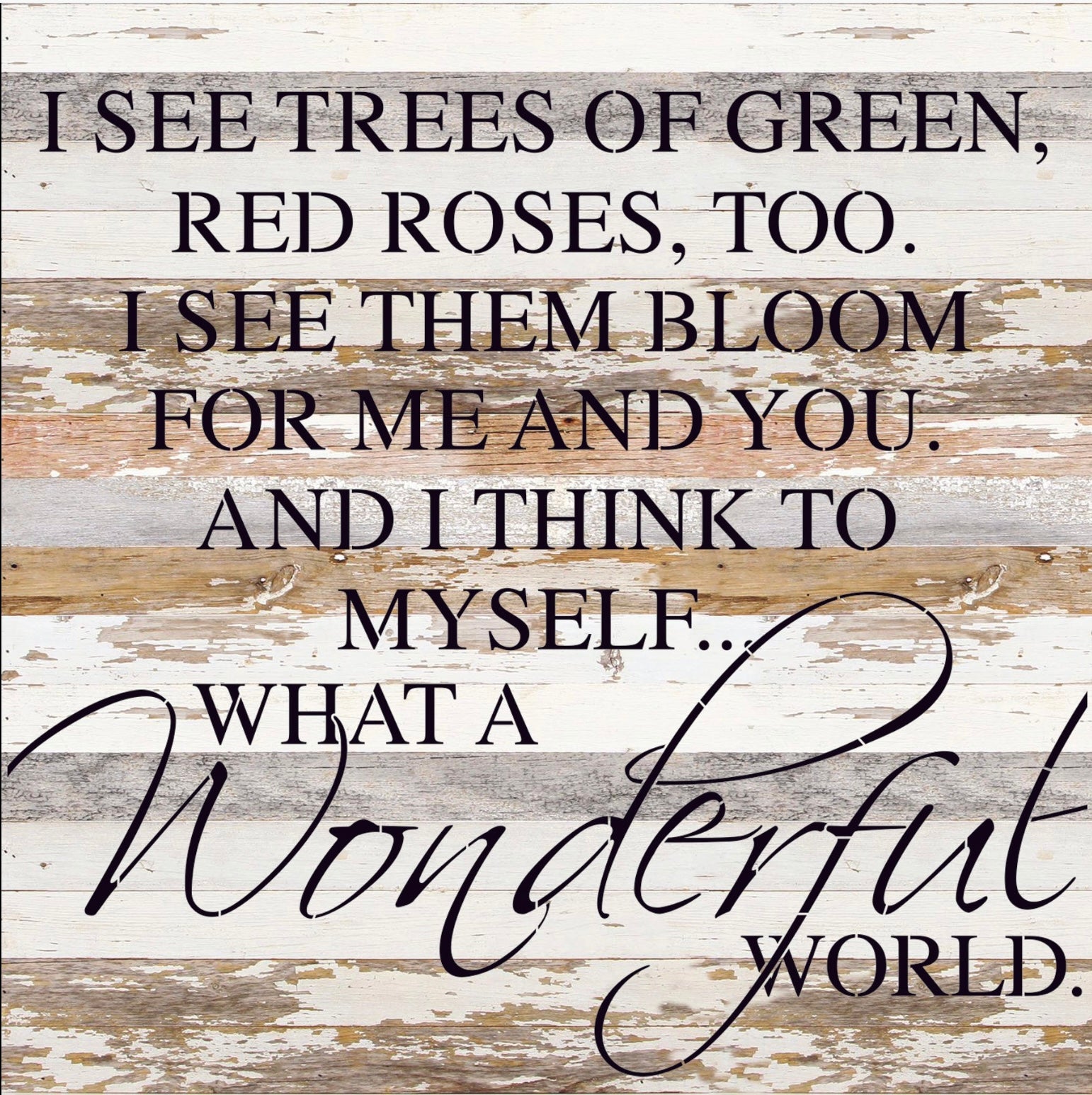 I see trees of green, red roses too. I see them bloom for me and you. And I think to myself... What a wonderful world. Armstrong / 28"x28" Reclaimed Wood Sign